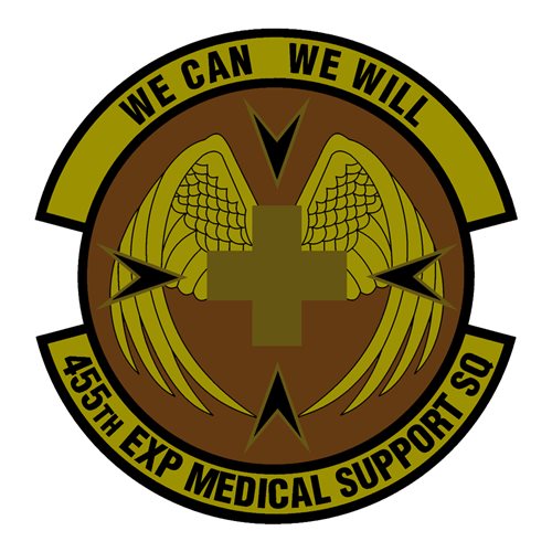 Custom patches for 455th Expeditionary Medical Support Squadron at Bagram Airfield, Afghanistan. Our 455 EMDSS patches are 100% embroidered with Velcro backing.