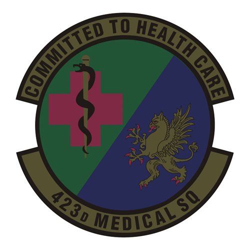 Custom patches for the 423rd Medical Squadron at Royal Air Force Station, Huntingdon, England. Our 423 MDS patches are 100% embroidered with Velcro backing.