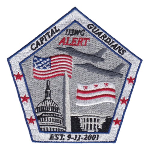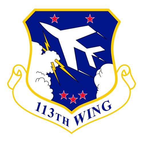 Custom patches for the 113th Wing of the District of Columbia Air National Guard at Joint Base Andrews, Camp Springs, Maryland. Our 113 WG patches are 100% embroidered with Velcro backing.