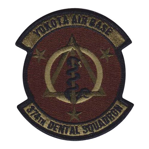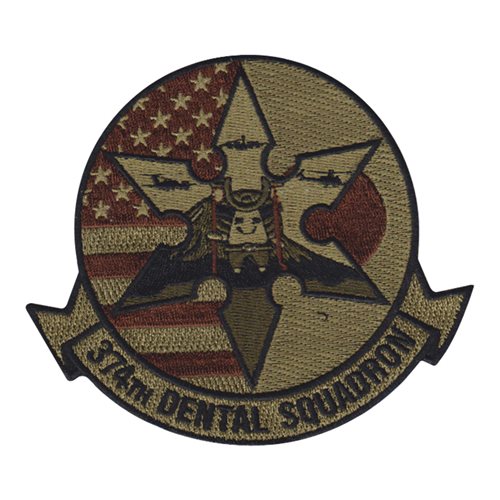 Custom patches for the 374th Dental Squadron at Yokota Air Base, Japan. Our 374 DS patches are 100% embroidered with Velcro backing.