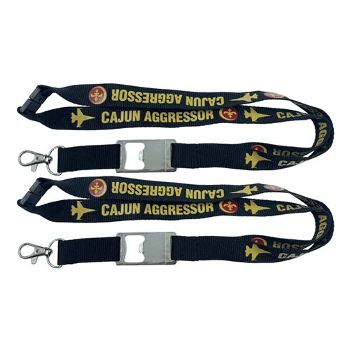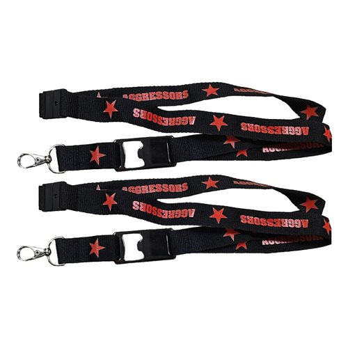 Our most popular style is a 3/4 inch wide screen-printed imprinted polyester lanyard. Our recommended design includes a safety breakaway at the neck, a plastic buckle to detach your badges, with a large clasp. The large hook will accommodate several flight line badges, ID cards, and secure facility proximity access cards. That width of lanyard is comfortable to wear and will not cut into your neck.