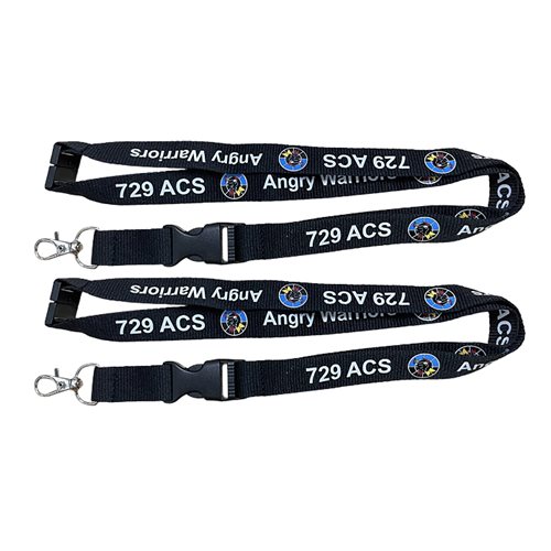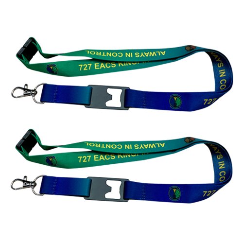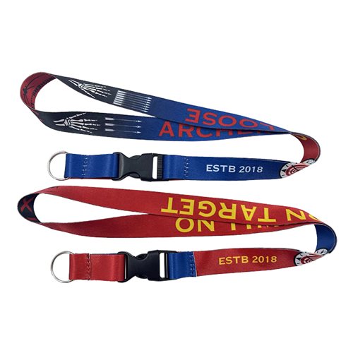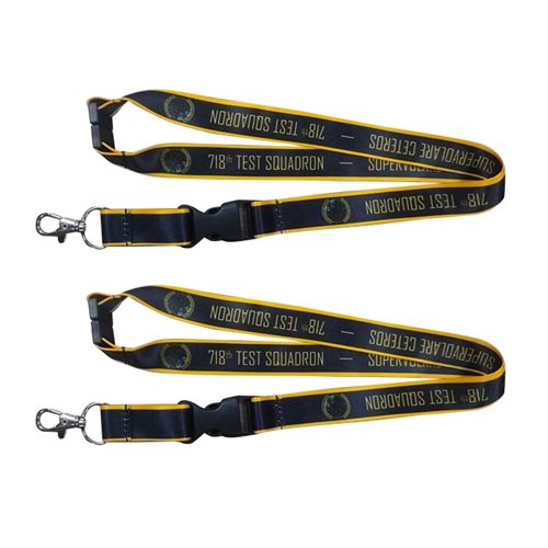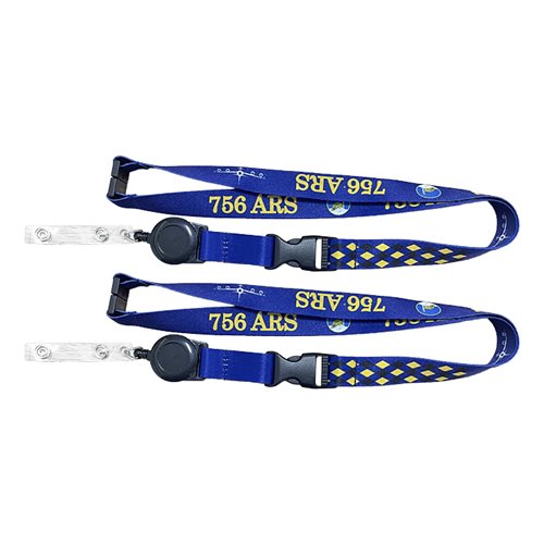 Our most popular style is a 3/4 inch wide screen-printed imprinted polyester lanyard. Our recommended design includes a safety breakaway at the neck, a plastic buckle to detach your badges, with a large clasp. The large hook will accommodate several flight line badges, ID cards, and secure facility proximity access cards. That width of lanyard is comfortable to wear and will not cut into your neck.