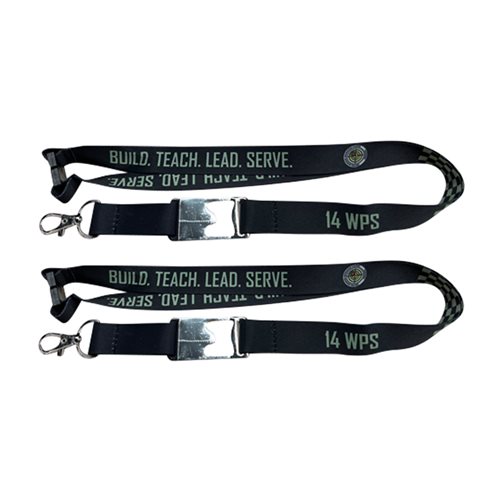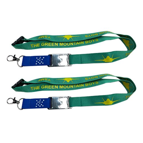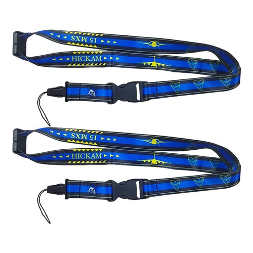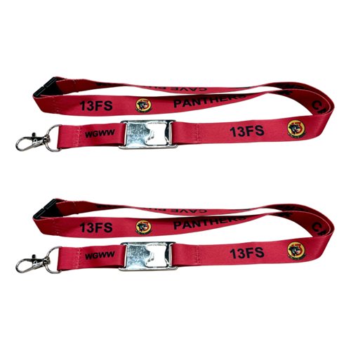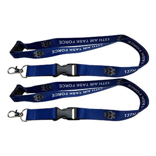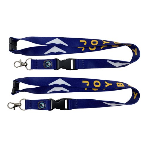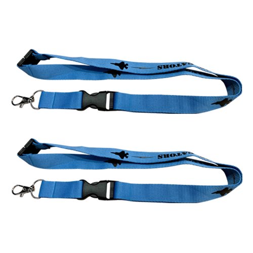 Our most popular style is a 3/4 inch wide screen-printed imprinted polyester lanyard. Our recommended design includes a safety breakaway at the neck, a plastic buckle to detach your badges, with a large clasp. The large hook will accommodate several flight line badges, ID cards, and secure facility proximity access cards. That width of lanyard is comfortable to wear and will not cut into your neck.