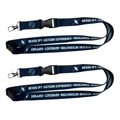 Our most popular style is a 3/4 inch wide screen-printed imprinted polyester lanyard. Our recommended design includes a safety breakaway at the neck, a plastic buckle to detach your badges, with a large clasp. The large hook will accommodate several flight line badges, ID cards, and secure facility proximity access cards. That width of lanyard is comfortable to wear and will not cut into your neck.