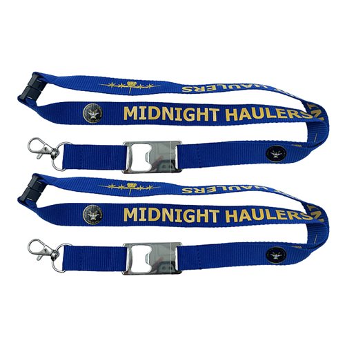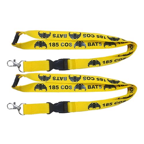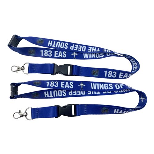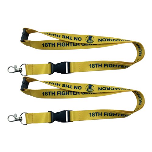 Our most popular style is a 3/4 inch wide screen-printed imprinted polyester lanyard. Our recommended design includes a safety breakaway at the neck, a plastic buckle to detach your badges, with a large clasp. The large hook will accommodate several flight line badges, ID cards, and secure facility proximity access cards. That width of lanyard is comfortable to wear and will not cut into your neck.