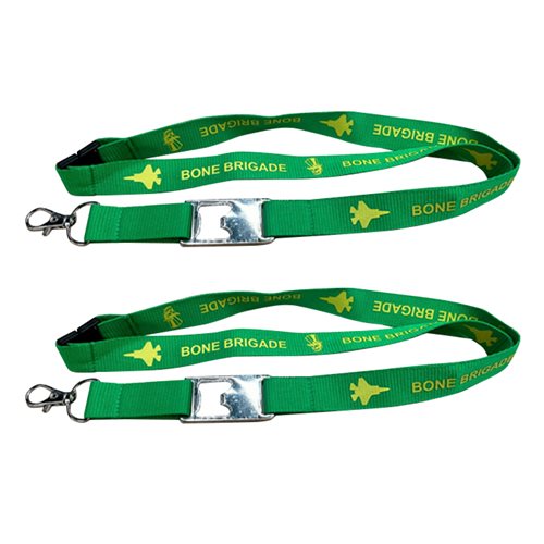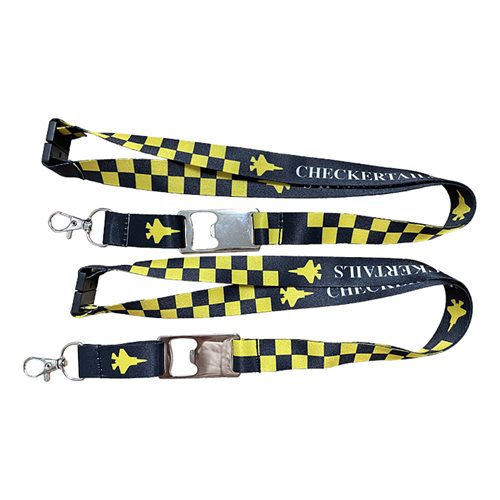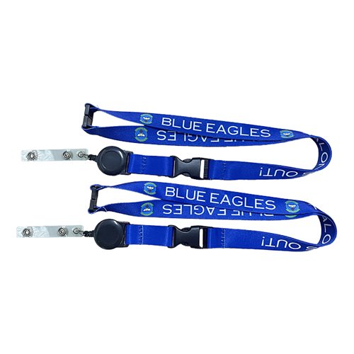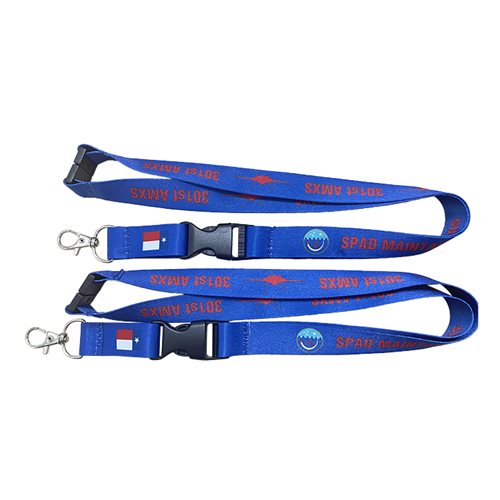 Our most popular style is a 3/4 inch wide screen-printed imprinted polyester lanyard. Our recommended design includes a safety breakaway at the neck, a plastic buckle to detach your badges, with a large clasp. The large hook will accommodate several flight line badges, ID cards, and secure facility proximity access cards. That width of lanyard is comfortable to wear and will not cut into your neck.