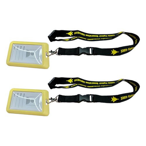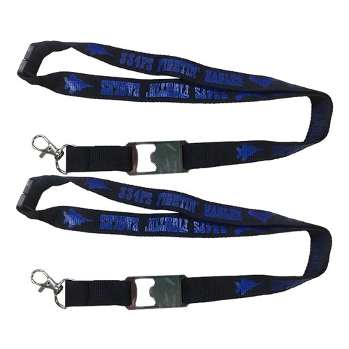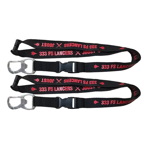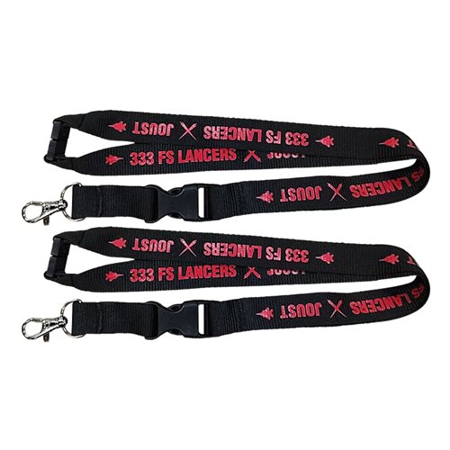 Our most popular style is a 3/4 inch wide screen-printed imprinted polyester lanyard. Our recommended design includes a safety breakaway at the neck, a plastic buckle to detach your badges, with a large clasp. The large hook will accommodate several flight line badges, ID cards, and secure facility proximity access cards. That width of lanyard is comfortable to wear and will not cut into your neck.