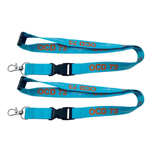 Our most popular style is a 3/4 inch wide screen-printed imprinted polyester lanyard. Our recommended design includes a safety breakaway at the neck, a plastic buckle to detach your badges, with a large clasp. The large hook will accommodate several flight line badges, ID cards, and secure facility proximity access cards. That width of lanyard is comfortable to wear and will not cut into your neck.