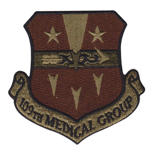Custom patches for the 109th Medical Group at Air National Guard Base, New York. Our 109 MDG NY ANG patches are 100% embroidered with Velcro backing.