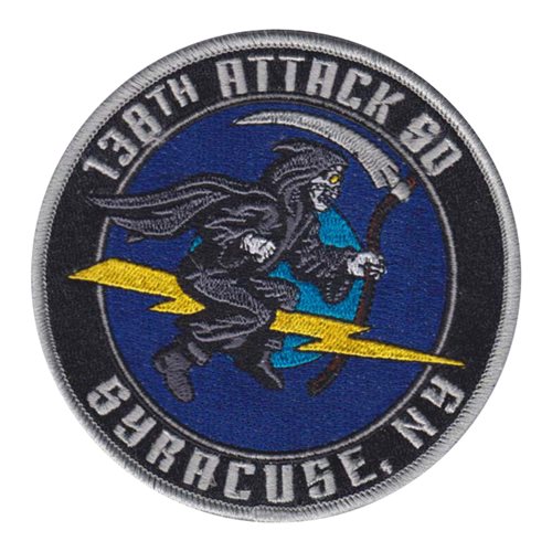 Custom patches for 138th Attack Squadron of the New York Air National Guard. Our 138 ATKS NY ANG patches are 100% embroidered with Velcro backing.