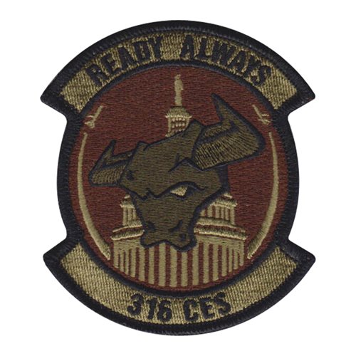 Custom patches for the 316th Civil Engineer Squadron at Andrews Air Force Base, Maryland. Our 316 CES patches are 100% embroidered with Velcro backing.