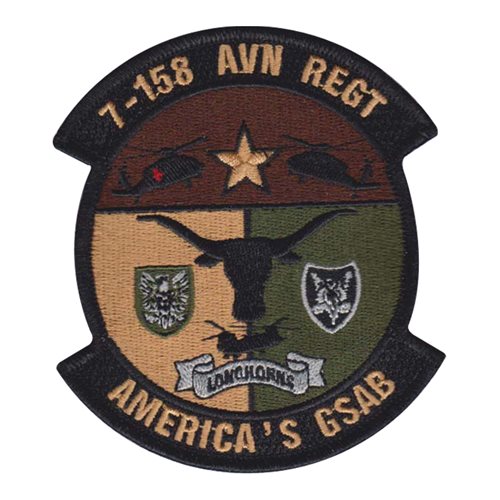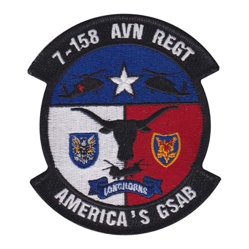 Custom patches for the 7th Battalion, 158th Aviation. Our 7-158 AVN patches are 100% embroidered with Velcro backing.
