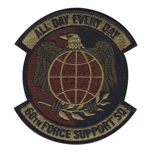 Custom patches for the 60th Force Support Squadron at Operating Site Eglin Air Force Base, Western Florida. Our 60 FSS patches are 100% embroidered with Velcro backing.