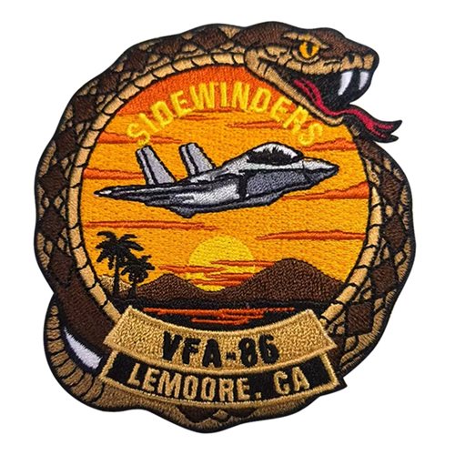 Custom patches for the Strike Fighter Squadron Eight Six at Naval Air Station Lemoore, California. Our VFA-86 patches are 100% embroidered with Velcro backing.
