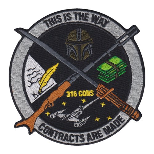 Custom patches for the 316th Contracting Squadron at Andrews Air Force Base, Maryland. Our 316 CONS patches are 100% embroidered with Velcro backing.