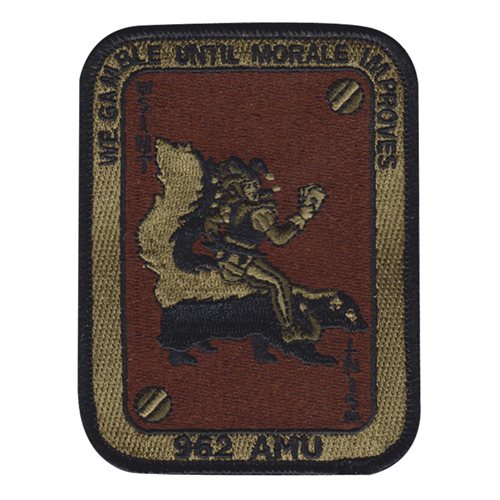Custom patches for the 962nd Aircraft Maintenance Unit at Joint Base Elmendorf-Richardson, Anchorage, Alaska. Our 962 AMU patches are 100% embroidered with Velcro backing.
