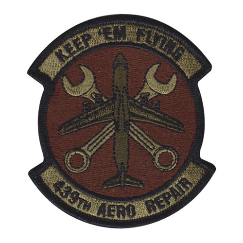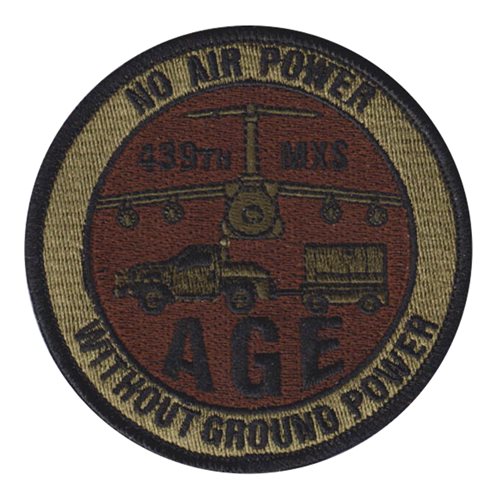 Custom patches for the 439th Maintenance Squadron at Westover Air Reserve Base, Chicopee Massachusetts. Our 439 MXS patches are 100% embroidered with Velcro backing.
