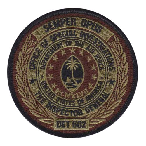 Custom patches for the Office of Special Investigations Detachment 602 at Andersen Air Force Base, Guam. Our OSI Det 602 patches are 100% embroidered with Velcro backing.