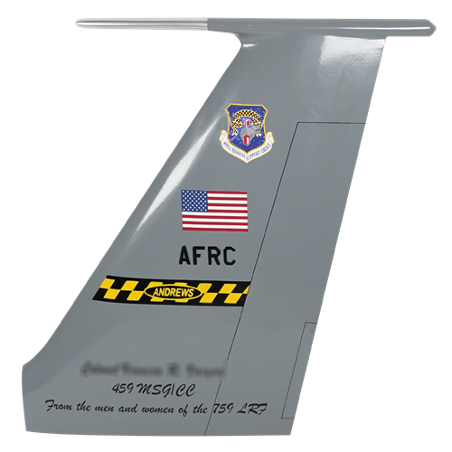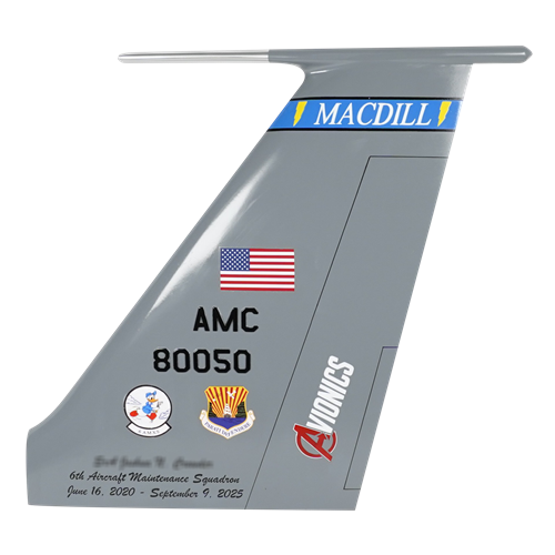 Your custom mahogany wood KC-135 Stratotanker aircraft tail flashes are hand-carved and painted with squadron markings, any patch, tail number, and any three lines of personalized text.