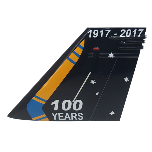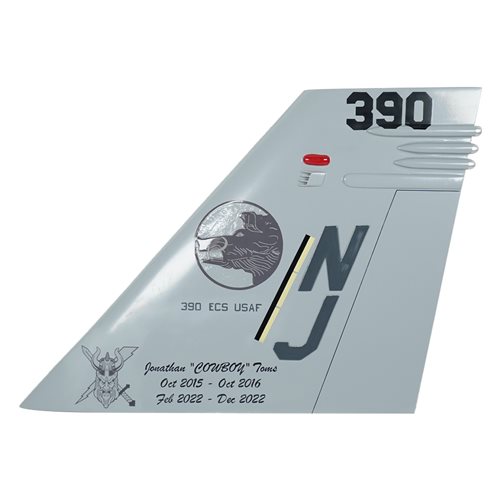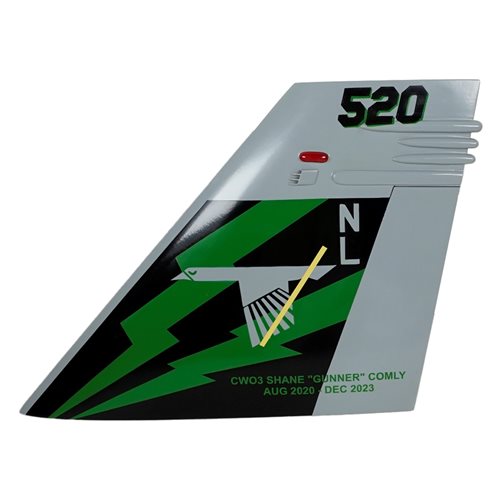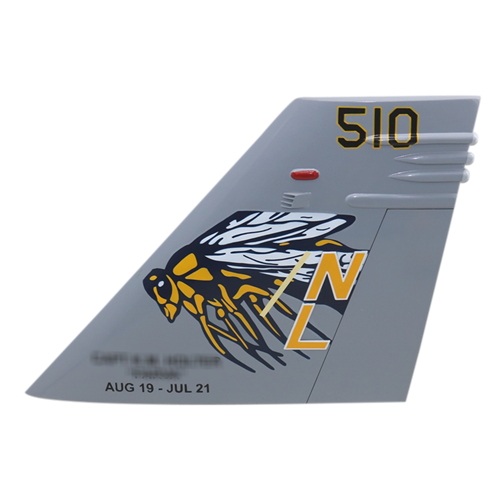 Your custom mahogany wood EA-18G Growler aircraft tail flashes are hand-carved and painted with squadron markings, any patch, tail number, and any three lines of personalized text.