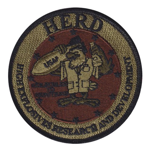 Custom patches for High Explosive Research and Development at Eglin Air Force Base, Florida. Our HERD patches are 100% embroidered with Velcro backing.
