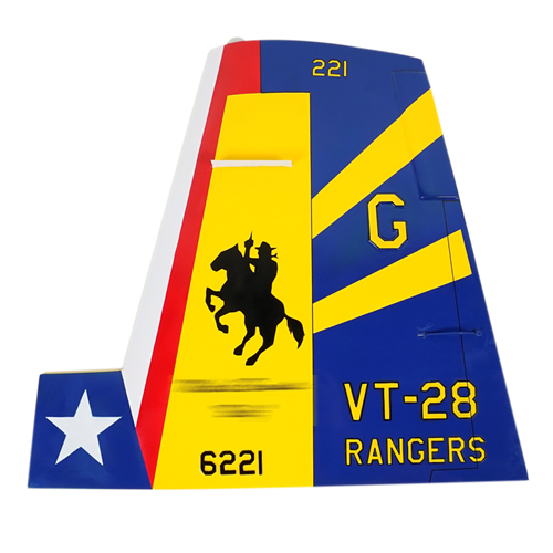 Your custom mahogany wood T-6A/B Texan II aircraft tail flashes are hand-carved and painted with squadron markings, any patch, tail number, and any three lines of personalized text.