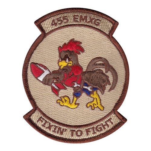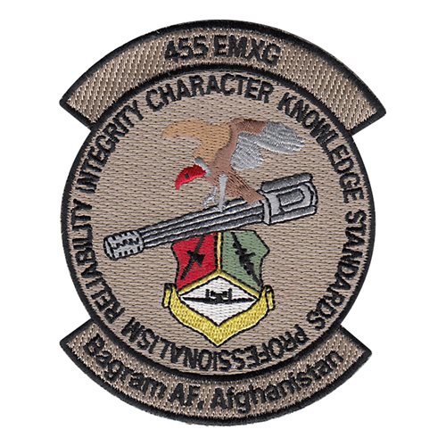 Custom patches for 455th Expeditionary Maintenance Group at Bagram Airfield, Afghanistan. Our 455 EMXG patches are 100% embroidered with Velcro backing.