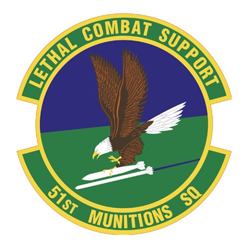 Custom patches for the 51st Munitions Squadron at Osan Air Base, Republic of Korea. Our 51 MUNS patches are 100% embroidered with Velcro backing.