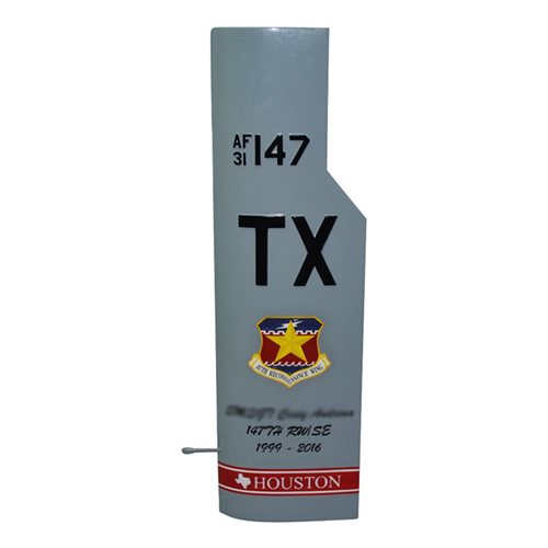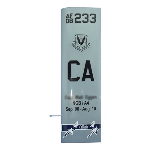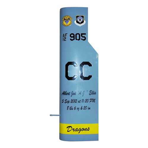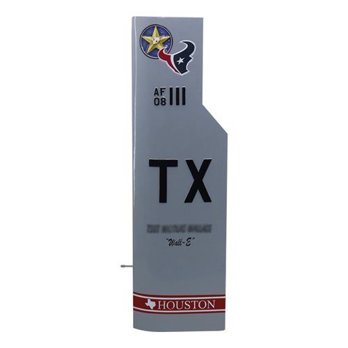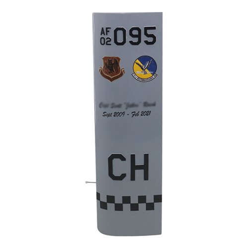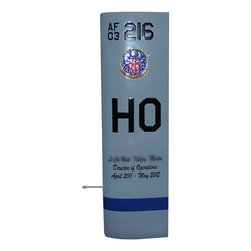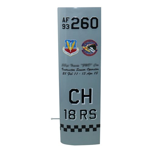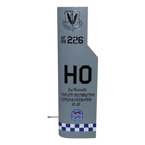 Your custom mahogany wood MQ-1 Predator aircraft tail flashes are hand-carved and painted with squadron markings, any patch, tail number, and any three lines of personalized text.