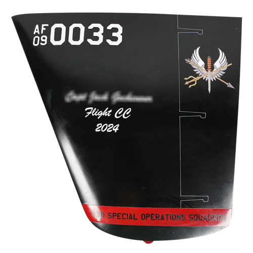 Your custom mahogany wood MQ-9 Reaper aircraft tail flashes are hand-carved and painted with squadron markings, any patch, tail number, and any three lines of personalized text.