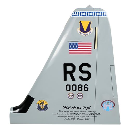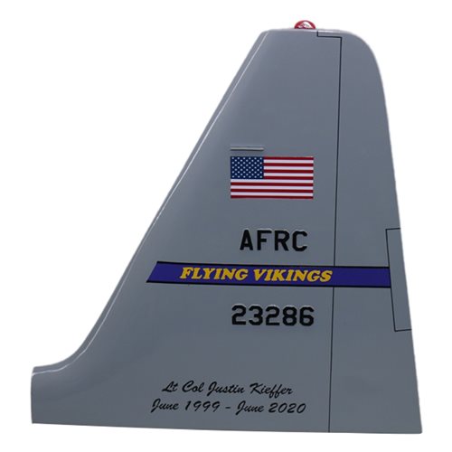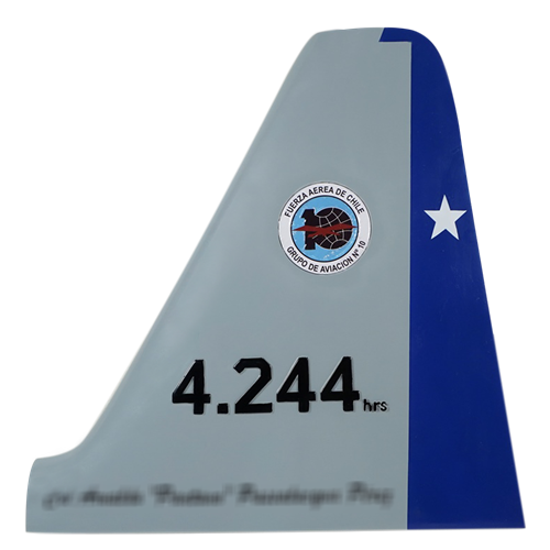 Your custom mahogany wood C-130 Hercules aircraft tail flashes are hand-carved and painted with squadron markings, any patch, tail number, and any three lines of personalized text.