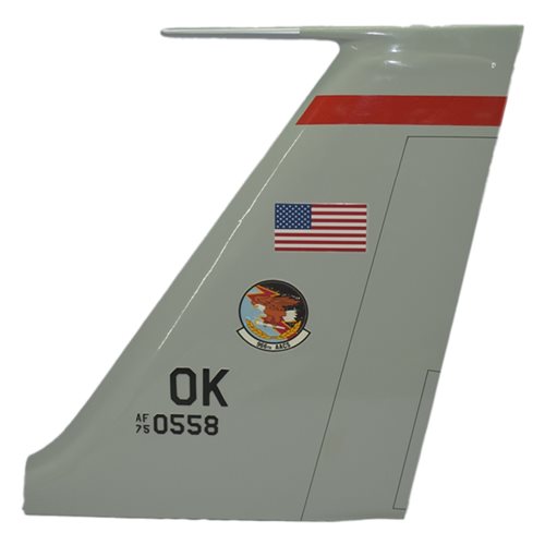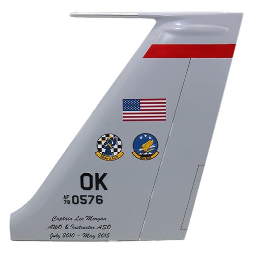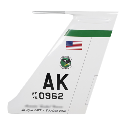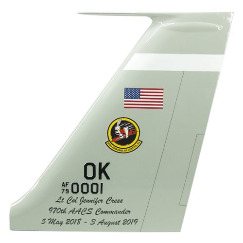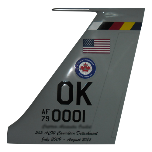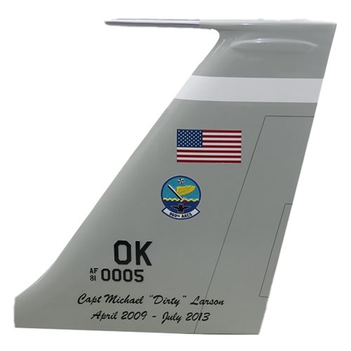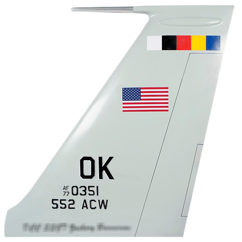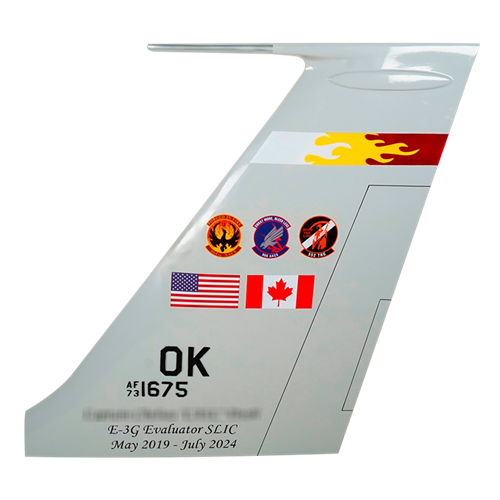 Your custom mahogany wood E-3 Sentry aircraft tail flashes are hand-carved and painted with squadron markings, any patch, tail number, and any three lines of personalized text.
