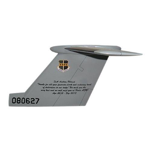 Your custom mahogany wood MC-12W Liberty aircraft tail flashes are hand-carved and painted with squadron markings, any patch, tail number, and any three lines of personalized text.