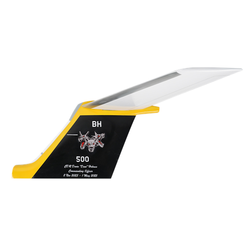 Your custom mahogany wood C-37A Gulfstream V aircraft tail flashes are hand-carved and painted with squadron markings, any patch, tail number, and any three lines of personalized text.