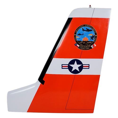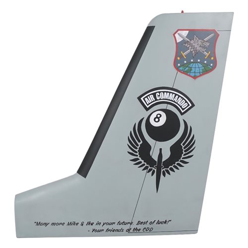 Your custom mahogany wood HC-144A Ocean Sentry aircraft tail flashes are hand-carved and painted with squadron markings, any patch, tail number, and any three lines of personalized text.