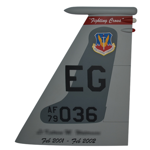 Your custom mahogany wood F-15C Eagle aircraft tail flashes are hand-carved and painted with squadron markings, any patch, tail number, and any three lines of personalized text.