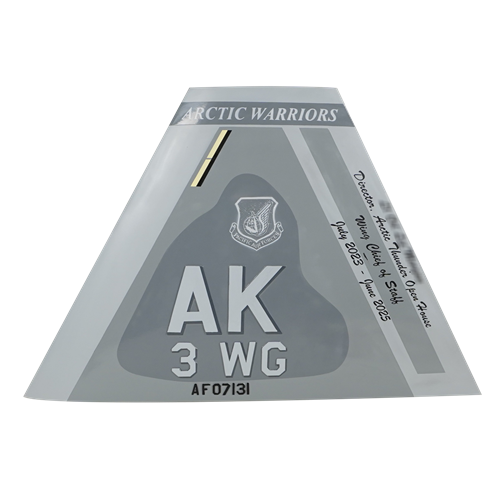 Your custom mahogany wood F-22A Raptor aircraft tail flashes are hand-carved and painted with squadron markings, any patch, tail number, and any three lines of personalized text.