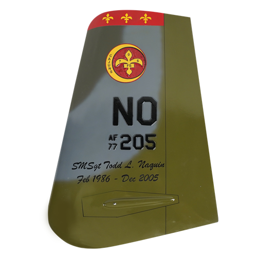 Your custom mahogany wood A-10 Thunderbolt aircraft tail flashes are hand-carved and painted with squadron markings, any patch, tail number, and any three lines of personalized text.