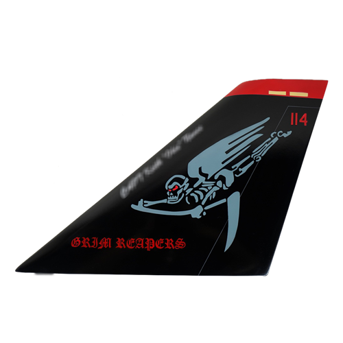 Your custom mahogany wood F-14D Super Tomcat aircraft tail flashes are hand-carved and painted with squadron markings, any patch, tail number, and any three lines of personalized text.