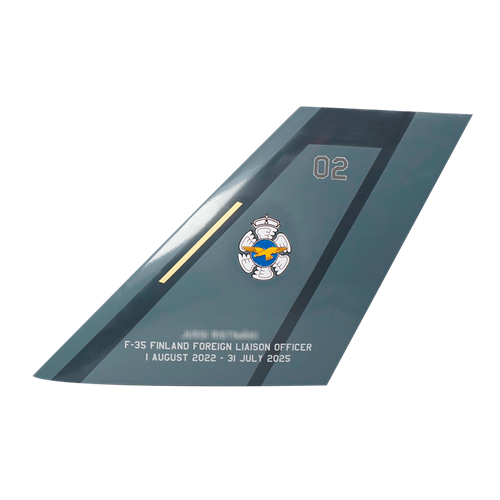 Your custom mahogany wood F-35 Lightning II aircraft tail flashes are hand-carved and painted with squadron markings, any patch, tail number, and any three lines of personalized text.