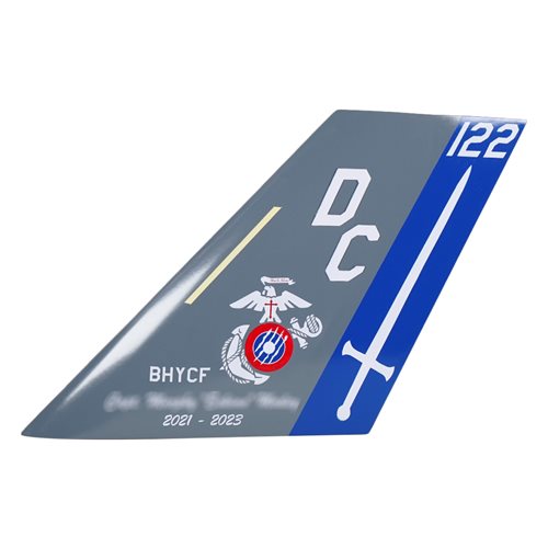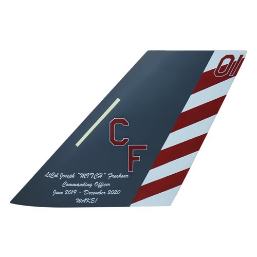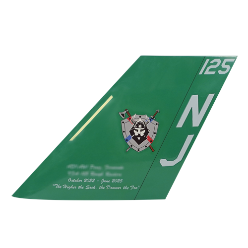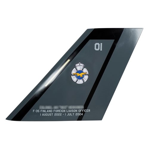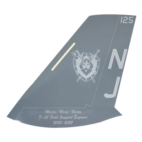 Your custom mahogany wood F-35 Lightning II aircraft tail flashes are hand-carved and painted with squadron markings, any patch, tail number, and any three lines of personalized text.