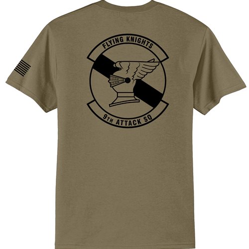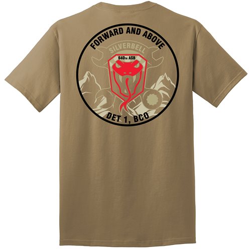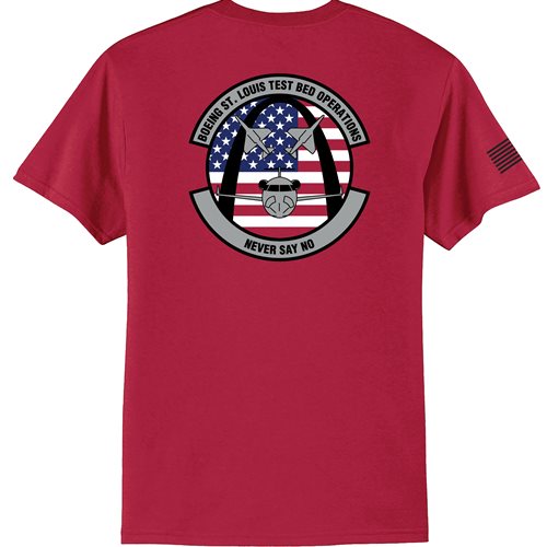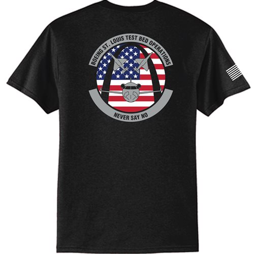 One idea is to have us reduce your squadron emblem to a 1-color design for the front left chest and then we can create a unique full-color image for the back of the shirt. Or go with your color patch on the front with a custom 1 or 2 color design on the back.