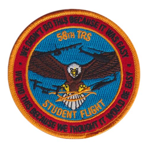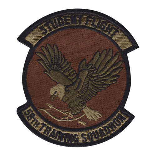 Custom patches for the 58th Training Squadron at at Kirtland Air Force Base, New Mexico. Our 58 TRS patches are 100% embroidered with Velcro backing.