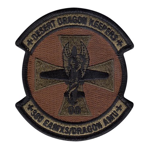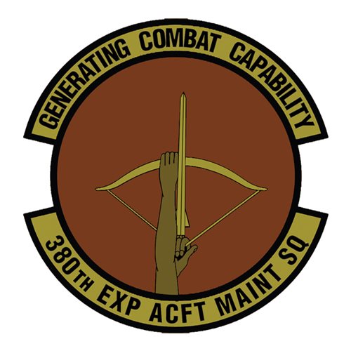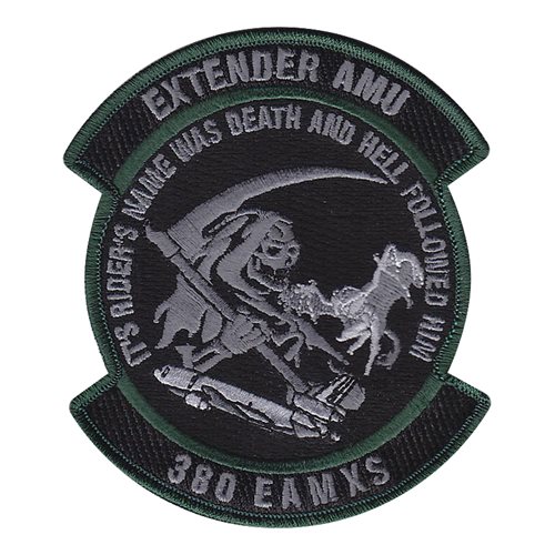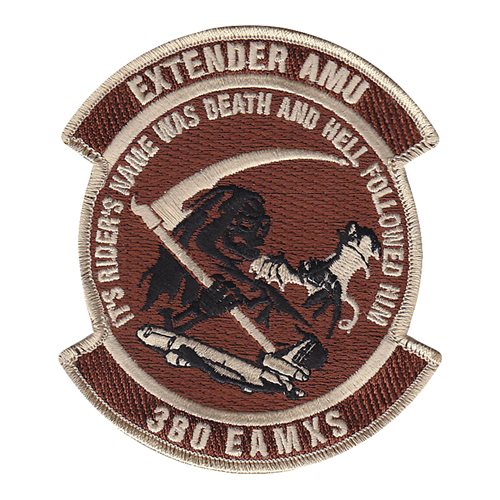 Custom patches for the 380th Expeditionary Aircraft Maintenance Squadron at Al Dhafra Air Base, United Arab Emirates. Our 380 EAMXS patches are 100% embroidered with Velcro backing.