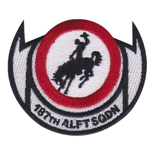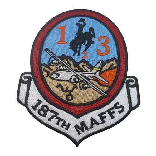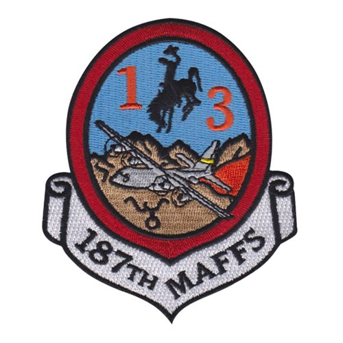 Custom patches for the 187th Airlift Squadron at Cheyenne Air National Guard Base, Wyoming. Our 187 AS patches are 100% embroidered with Velcro backing.