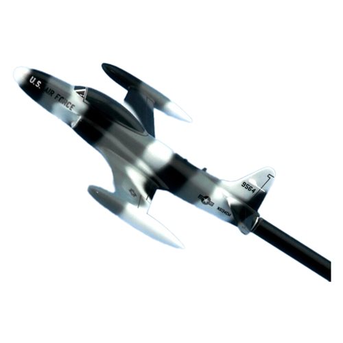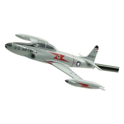 Your Lockheed T-33 T-bird custom briefing stick is created just for you! Our aircraft briefing stick models are hand-carved from solid mahogany wood, with detailed squadron markings and unique bureau number. The 6 inch long airplane model is attached to a sturdy wooden rod, and is a perfect training aid for briefing and debriefing BFM and surface attack.