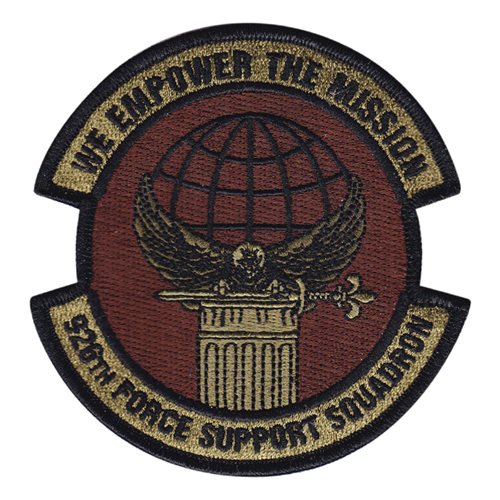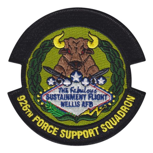 Custom patches for the 926th Force Support Squadron at Nellis Air Force Base, Nevada. Our 926 FSS patches are 100% embroidered with Velcro backing.