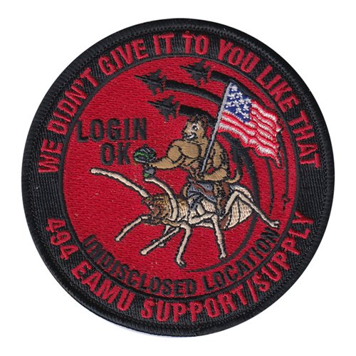 Custom patches for the 494th Aircraft Maintenance Unit at RAF Lakenheath, England. Our 494 AMU patches are 100% embroidered with Velcro backing.