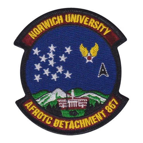 Custom patches for the Air Force Reserve Officers’ Training Corps Detachment 867 Norwich University. Our AFROTC Det 867 patches are 100% embroidered with Velcro backing.
