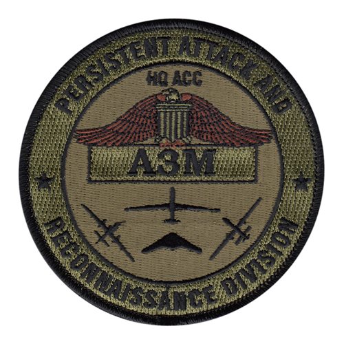 Custom patches for the Headquarters Air Combat Command Reconnaissance Operations Division at Langley Field, Joint Base Langley–Eustis, Virginia. Our HQ ACC A3M patches are 100% embroidered with Velcro backing.